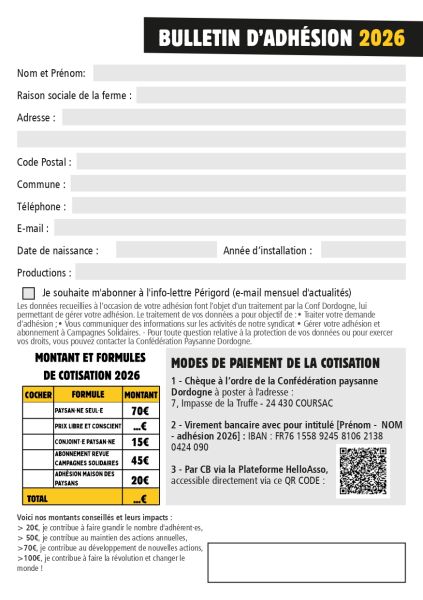 Vous souhaitez adhérer à la Confédération Paysanne Dordogne pour l'année 2026? Nous en sommes ravi.e.s !